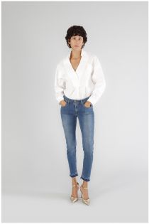 Jean modèle brigitte avec une coupe skinny. fabriqué en toile super extensible. le vêtement est conçu pour envelopper la silhouette et mettre en valeur les formes. cinq poches fermeture classique et passants de ceinture.