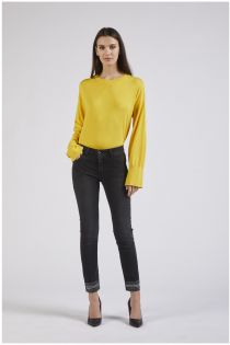 Jean en toile denim super-extensible à la ligne slim. décoration en strass sur le bas de la jambe.