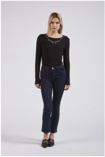 Jean en toile denim super stretch à la ligne slim. application de strass ambrés sur les hanches.