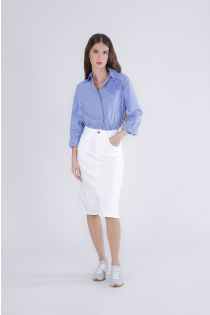Jupe en denim stretch au design féminin et polyvalent. jupe mi-longue fendue sur le devant qui affine la silhouette et assure une grande liberté de mouvement. idéale pour un look décontracté ou urbain chic. le mannequin mesure 1.75 m et porte une taille s. coupe : standard.