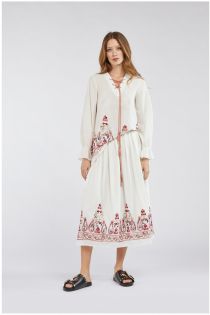 Jupe mi-longue large en mousseline de coton avec broderie particulière dans le bas. La taille élastique, qui permet au vêtement d’être confortable et polyvalent pour différentes morphologies, est ornée d'un cordon de serrage particulier avec des pampilles.