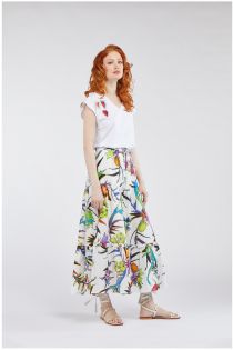 Jupe longue façon gitane avec volants froncés et élastique à la taille. Disponible dans trois imprimés exclusifs.