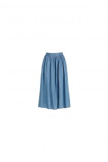 Jupe longue en Tencel effet jean. Le vêtement présente des contrastes de tissus imprimés et un élastique au dos de la ceinture pour la ligne.