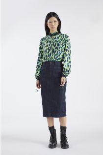 Jupe mi-longue en toile denim confort avec surpiqûres spéciales en zigzag avec un fil contrastant et un bouton précieux verni