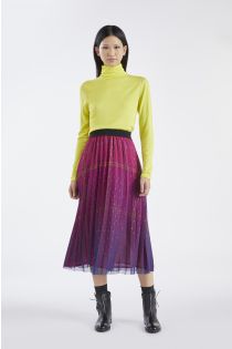 Jupe plissée réalisée à partir d'un tissu fil coupé imprimé vif qui donne des points lumineux irisés.