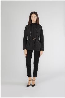 Pièce indispensable du dressing printanier. manteau court avec capuche et ceinture avec boucle logo en tissu technique. manches longues.