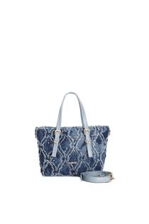 Mini cabas en denim avec détails frangés orné de rivets et de strass. poignées et bandoulière réglable et amovible en matière lisse pour une touche d'élégance décontractée.