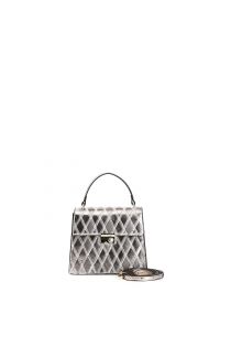 Mini-sac rigide en couleurs métallisées. patchwork en losange. un seul compartiment et une poche intérieure zippée. fermeture à bouton-pression avec accessoire en strass. sac avec bandoulière.