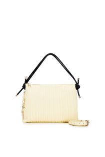 Mini sac, modèle « coussin bag », en matière souple avec plissage caractéristique ondulé et poignées nouées en couleur contrastante, orné d’accessoire pendentif CafèNoir.