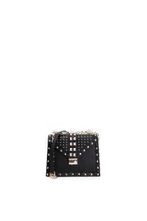 Mini sac avec chaînette pour le porter en bandoulière disséminée de strass et cabochons. Il y a également un grand strass sur la fermeture ainsi qu’un logo découpé au laser