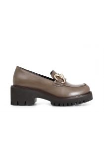 Mocassins en cuir pour femme avec attache dorée. le talon mesure 55 mm de haut. semelle intérieure en cuir confortable. semelle « char d’assaut ».