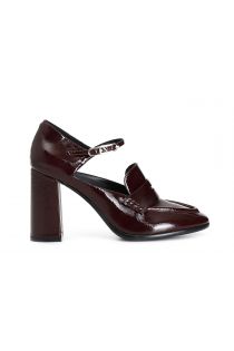 Mocassin pour femme en cuir verni avec bride et boucle personnalisée. talon carré de 88 mm. la semelle intérieure est en cuir. chaussure très polyvalente et chic pour interpréter avec style les looks de bureau et de loisirs.