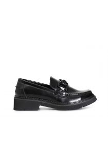 Mocassin pour femme en simili cuir enrichi d'un mors avec strass sur la boucle. la semelle intérieure est en cuir.