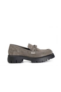 Mocassin femme en daim avec mignon. la doublure et la semelle intérieure sont en cuir. plateau de 25 mm de hauteur. talon de 40 mm.