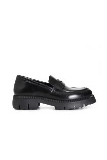 Mocassin pour femme en cuir avec boucle et accessoire pièce de monnaie. la doublure et la semelle intérieure sont en cuir. plateau de 25 mm de hauteur. talon de 40 mm.
