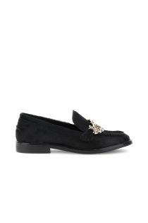 Mocassins pour femme en cuir noir effet poney, ornés d'une élégante bride en métal émaillé. Une semelle intérieure en cuir et un petit talon de 2 cm leur confèrent une allure chic et confortable.
