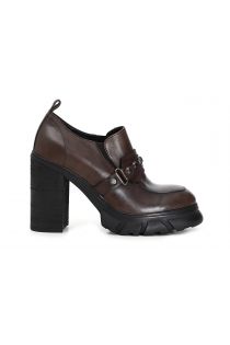 Mocassins en cuir avec talon haut et passant enrichi de cabochons. Plateau en caoutchouc décoré d'un motif rappelant le monde du sport.