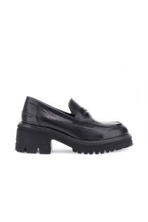 Mocassins en cuir brossé avec une élégante boucle sur le devant. Doublure et semelle intérieure en cuir. Semelle crantée avec un talon de 5,5 cm et une plateforme de 2,5 cm. Idéaux pour un look sophistiqué et tendance, parfaits pour la ville.