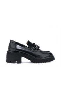 Mocassins en cuir brossé ornés d'une large chaîne brillante. Semelle plateforme de 2,5 cm et talon de 5,5 cm. Doublure et semelle intérieure en cuir. Une élégance audacieuse pour des looks contemporains affirmés.