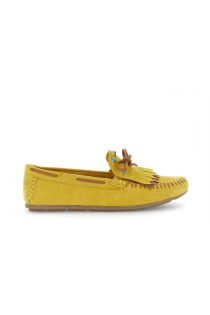 Mocassins en daim avec surpiqûres contrastées et franges. clous décoratifs doublure et semelle intérieure en cuir. un parfait mélange de confort de détails artisanaux et de style bohème contemporain.