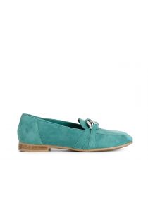 Mocassins femme en daim avec attache en chaîne. la semelle intérieure est en cuir. talon haut de 15 mm. modèle polyvalent et dynamique idéal pour compléter de nombreuses tenues.