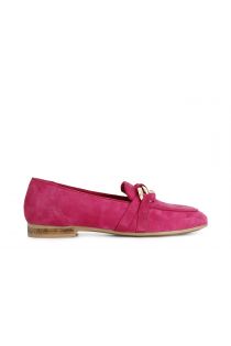 Mocassins femme en daim avec attache en chaîne. la semelle intérieure est en cuir. talon haut de 15 mm. modèle polyvalent et dynamique idéal pour compléter de nombreuses tenues.