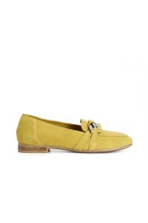 Mocassins femme en daim avec attache en chaîne. la semelle intérieure est en cuir. talon haut de 15 mm. modèle polyvalent et dynamique idéal pour compléter de nombreuses tenues.