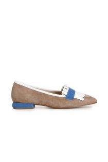 Mocassins en daim avec franges décoratives. talon gainé de cuir lamé de 15 mm de haut.