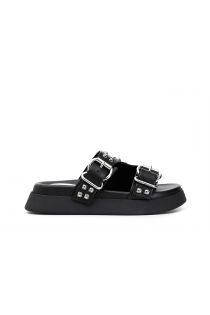 Mules en cuir avec deux boucles et des cabochons carrés à facettes, semelle intérieure confortable et semelle haute.