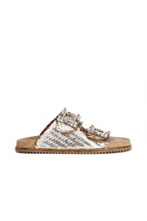 mules à double boucle strass en cuir tressé light gold