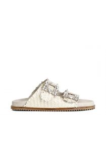Mules femme en cuir tressé avec double boucle en strass. semelle intérieure en cuir.