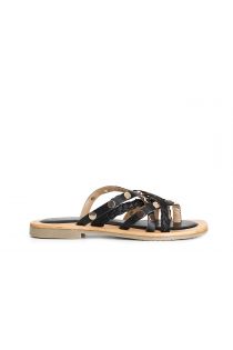Sandales basses modèle mules avec bandes alternées de cuir et de raphia décorées de cabochons dorés.