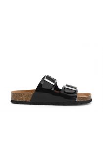 Mules deux bandes en verni avec boucle sur semelle renforcée.