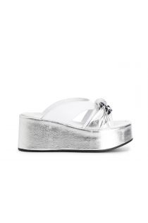 Mules en cuir laminé bicolore sur semelle compensée avec accessoire chaîne.