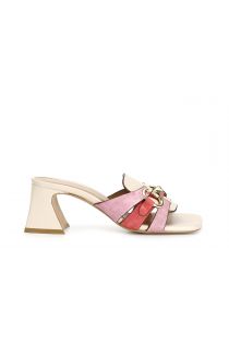 Mules en cuir et daim bicolores avec attache. talon h. 70 mm