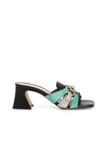 Mules en cuir et daim bicolores avec attache. talon h. 70 mm