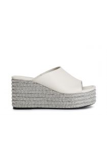 Mules nappa semelle compensée avec bandes de strass. la confortable semelle intérieure en cuir véritable rembourrée rend la chaussure confortable même après plusieurs heures d'utilisation. le talon haut mesure 70 mm de haut la plateforme 35 mm.