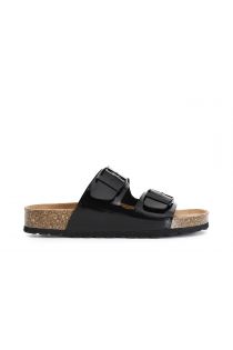 Mule femme en cuir verni. double bande avec boucles. confortable semelle intérieure.