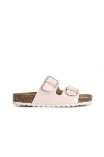 Mule femme en cuir verni. double bande avec boucles. confortable semelle intérieure.