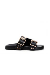 Sandales basses avec semelle anatomique en simili-cuir, semelle texture à rayures et trépointe à report avec petits clous. Jeu de fleurs entremêlées et arrêté par des rivets qui créent un patchwork de chevalin zébré ou léopard et simili-cuir.