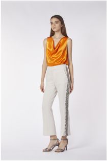 Pantalon en tissu fluide et bordure raffinée de paillettes sur les hanches enrichissant et ornant le vêtement le rendant donc parfait pour une soirée spéciale.