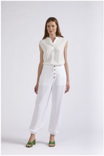 Pantalon avec boutons apparents et élastique à la cheville en lin mélangé frais.
