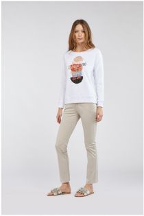 Pantalon chino intemporel en satin de coton stretch. Une application délicate de passementerie à perles sur la ceinture illumine le vêtement.