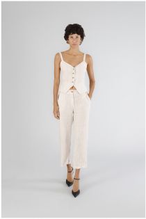 Pantalon droit élégant avec revers fixe en bas. modèle réalisé en tissu de lin à fines rayures. idéal à porter avec sa veste assortie.