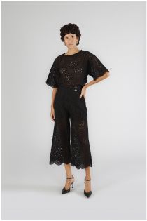 Pantalon palazzo confectionné en tissu broderie anglaise. modèle avec zip latéral et doublure short. pantalon parfait pour un look romantique et polyvalent.