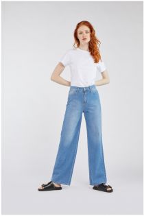 Pantalon à jambe large Gina en toile denim ferme avec poches arrière décalées qui créent un contraste particulier avec le lavage principal du vêtement.