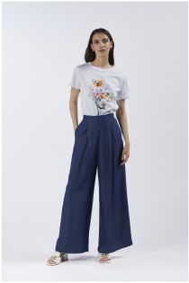 Pantalon long et large avec des plis sur le devant. réalisé en jean tencel. poches latérales. bride élastique dans le dos pour plus de confort.