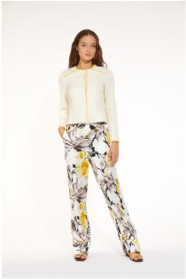Pantalon large raffiné en satin de viscose fantaisie, décoré par des bordures en satin contrastantes
