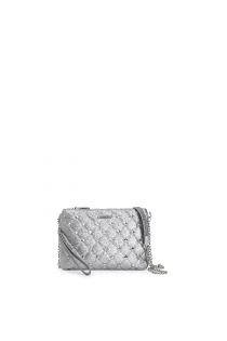 Pochette à paillettes avec cabochons hexagonaux. bandoulière en chaîne amovible et poignée de poignet. un seul compartiment et une poche intérieure zippée. fermeture à glissière.