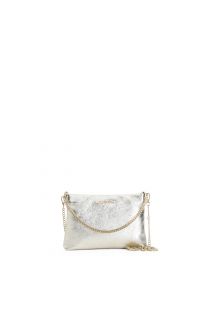 Pochette en cuir lamé avec bandoulière en chaîne. fermeture à glissière.